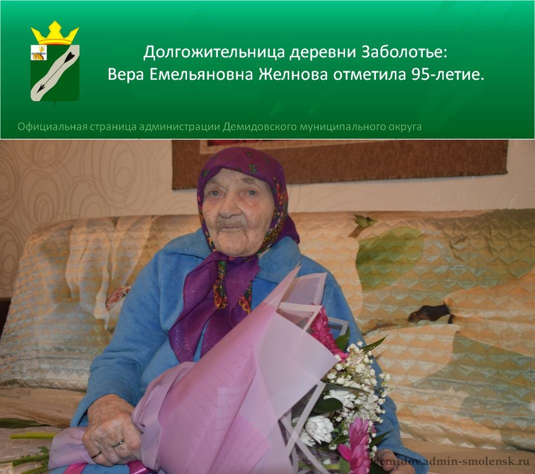 https://demidov.admin-smolensk.ru/administraciya-municipalnogo-obrazovaniya-demidovskij-rajon-smolenskoj-oblasti/news/95-letnij-yubilej-otmetila-zhitelnica-derevni-zabolote-vera-emelyanovna-zhelnova/
