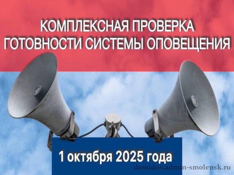 1 октября 2025 года с 10.00 до 11.30 будет проводиться проверка готовности системы оповещения населения Смоленской области с включением электрических сирен и доведением речевой информации до населения по средствам телерадиовещания, уличных громкоговорящих устройств, через информационно-телекоммуникационную сеть «Интернет» и мобильное приложение «МЧС России».