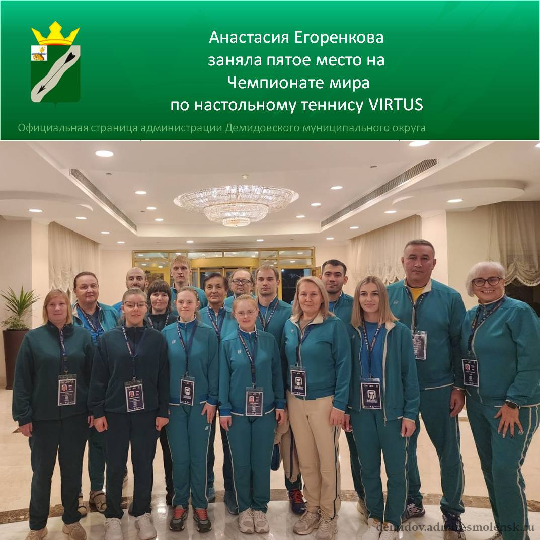 Спортсменка Анастасия Егоренкова из Демидовского округа заняла пятое место на Чемпионате мира по настольному теннису VIRTUS, который проходил с 1 по 8 ноября 2025 года в Каире, Египет.