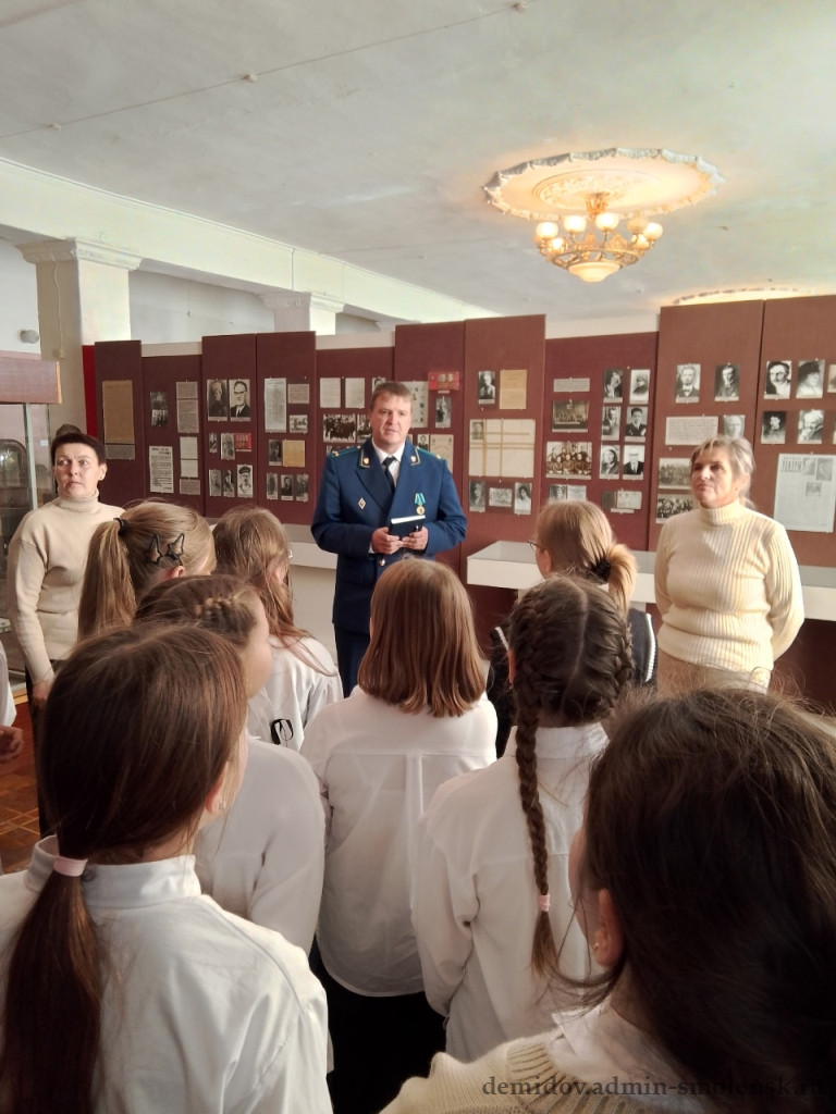 25 сентября День освобождения Смоленской области от немецко-фашистских захватчиков в Великой Отечественной войне1941-1945г.г. В этот день, на базе МБУК Демидовский историко-краеведческий музей прокурор Демидовского района А.Ю. Морозов провёл тематическую лекцию «По следам огненных лет» для обучающихся 5 класса «б» МБОУ СШ №1 (кл. руководитель С.А. Осташко), он рассказал ребятам о ключевых событиях Великой Отечественной войны, о героизме нашего народа и вкладе смолян в общую Победу. Мероприятие посвящено сохранению исторической памяти и патриотическому воспитанию молодежи. С.А. Осташко поблагодарила Антона Юрьевича за важную просветительскую инициативу, отметив, что такие встречи формируют у детей чувство гражданской ответственности.