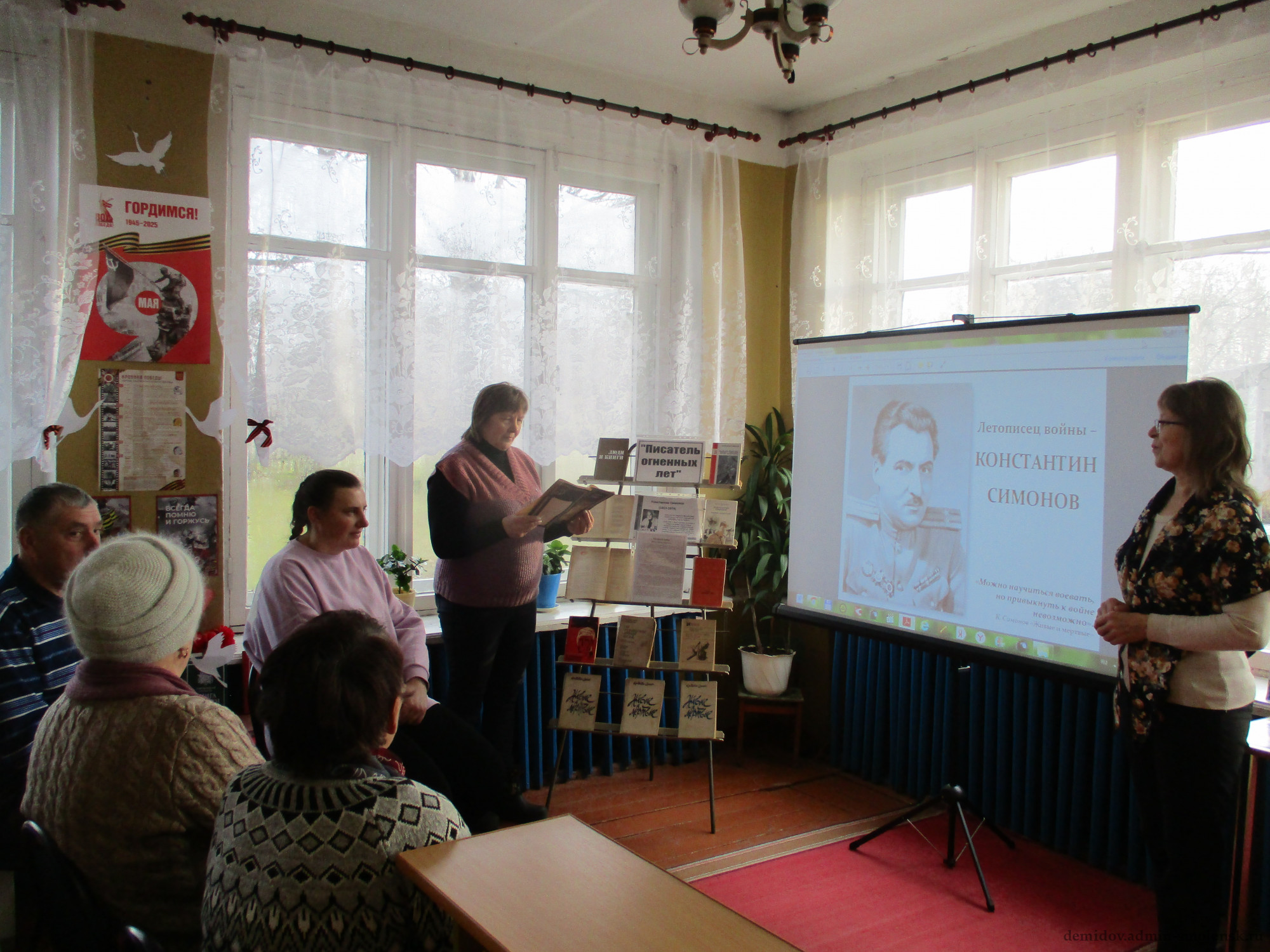 Заведующая библиотекой Е.Н. Акимова знакомя своих читателей с жизнью и творчеством Константина Михайловича Симонова, сопровождала рассказ показом презентации «Летописец войны – Константин Симонов». Познакомившись с биографией, участники мероприятия убедились, что война стала центральной темой в жизни и творчестве К.М. Симонова. Его произведения – от небольших репортажей и стихов до романа «Живые и мертвые» продолжают жить в сердцах поколений и истории нашей страны. Были прочитаны стихи автора: «Жди меня, и я вернусь», «Если дорог тебе твой дом», «Ты помнишь Алеша…» и др.