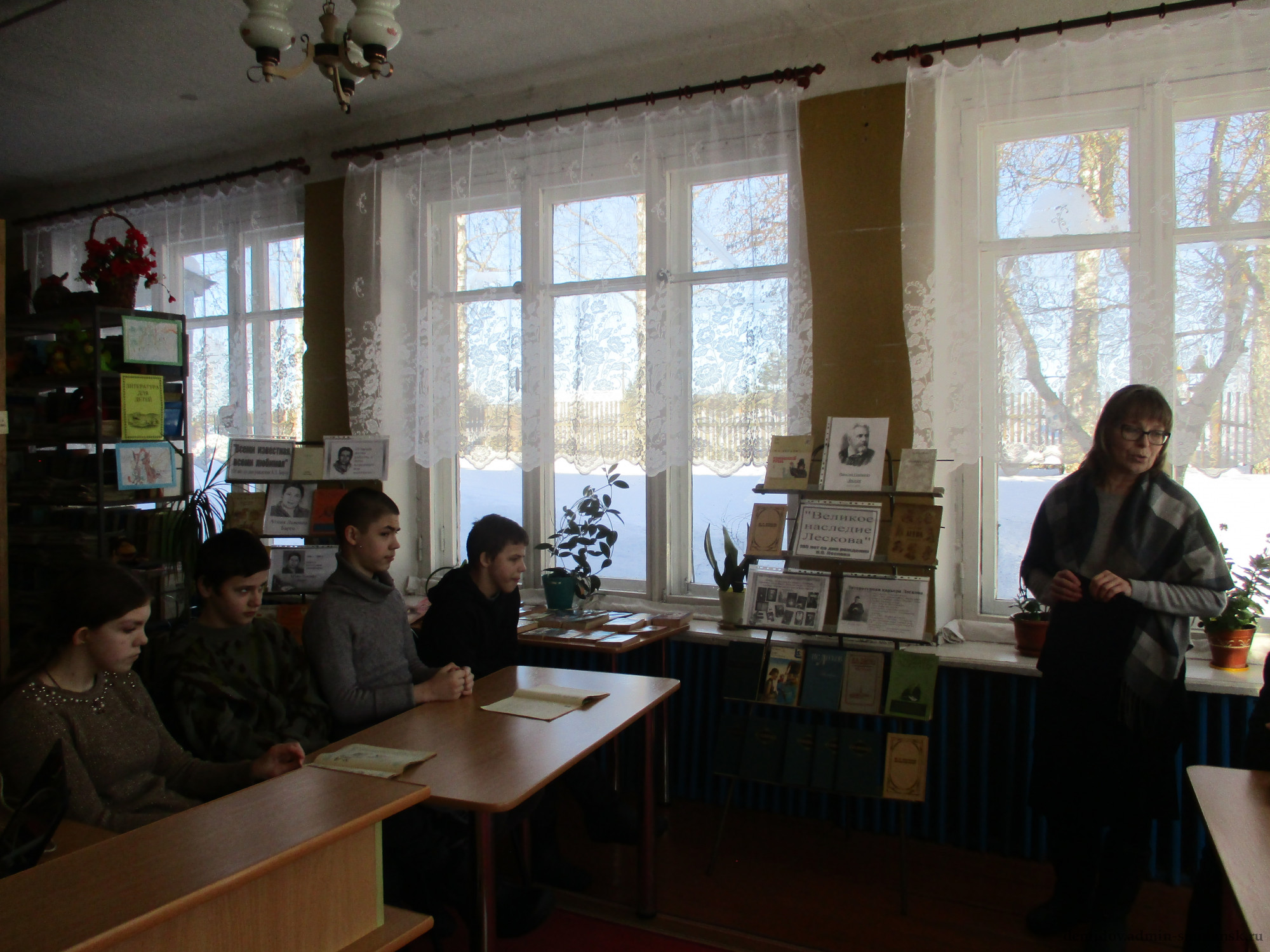Заведующая библиотекой Акимова Е.Н. познакомила присутствующих с биографией писателя, его творческим становлением. Делая обзор книжной выставки «Великое наследие Лескова», вспомнили и обсудили его произведения «Левша», «Неразменный рубль», «Леди Макбет Мценского уезда» и «Очарованный странник».