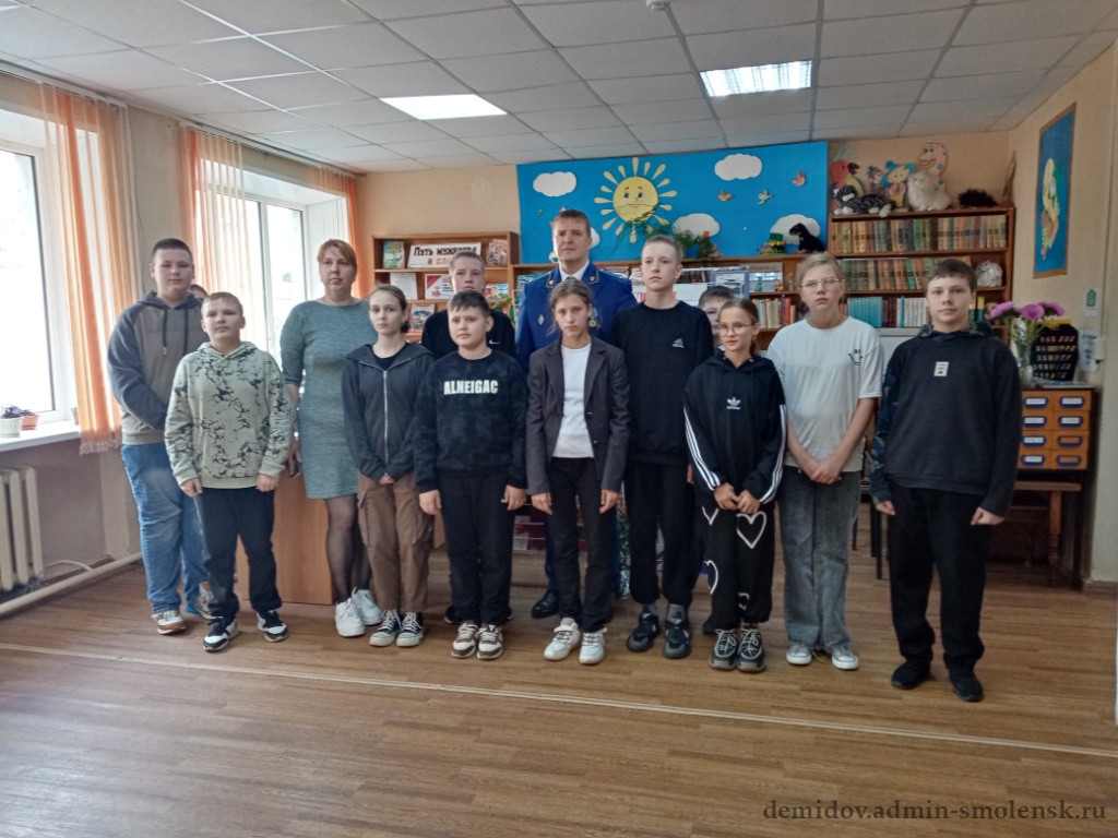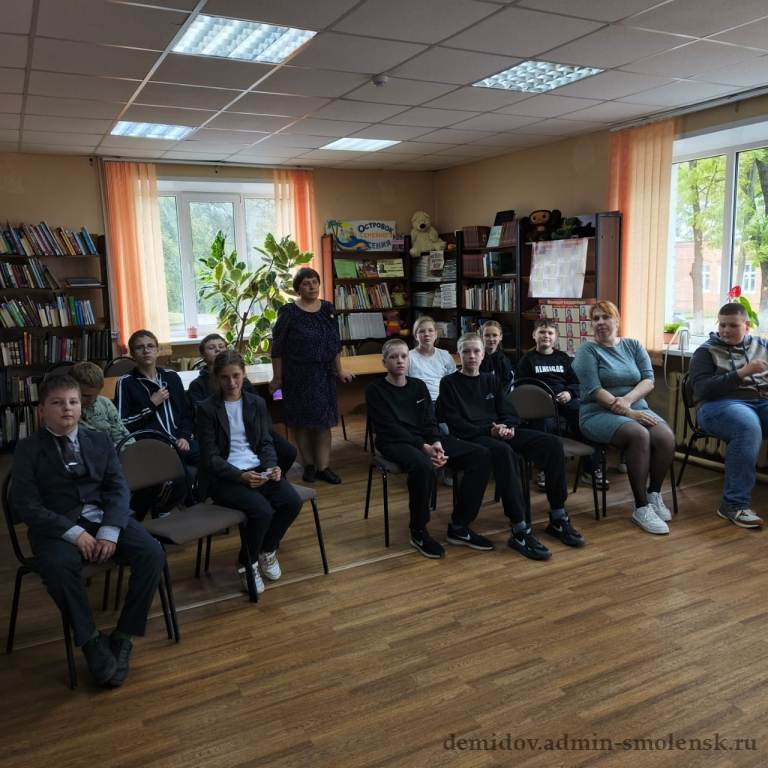 Заведующая Демидовской детской библиотекой Никитина Валентина Владимировна рассказала ученикам 7 «А» класса средней школы № 1 о ключевых событиях, происходивших на Смоленщине в годы оккупации с июля 1941 по сентябрь 1943гг., об освобождении области от немецко-фашистских захватчиков.