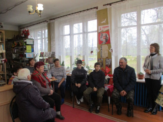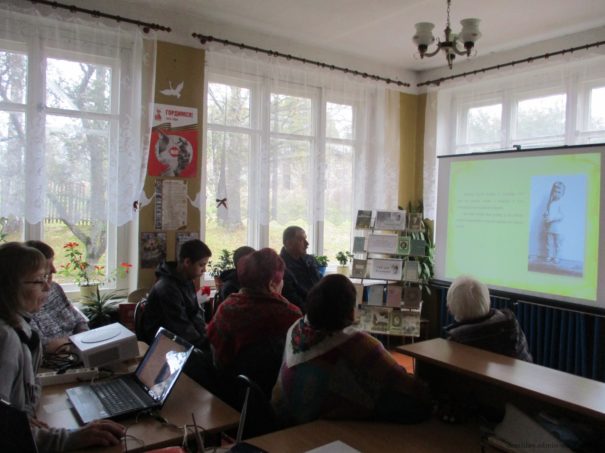 Заведующая библиотекой Е.Н. Акимова с помощью презентации «Жизнь и творчество Александра Сергеевича Есенина» познакомила присутствующих с яркими страницами биографии и творчества поэта. В ходе вечера прозвучали стихи: «Закружилась листва золотая…», «Русь», «Письмо матери», «Береза» и др.