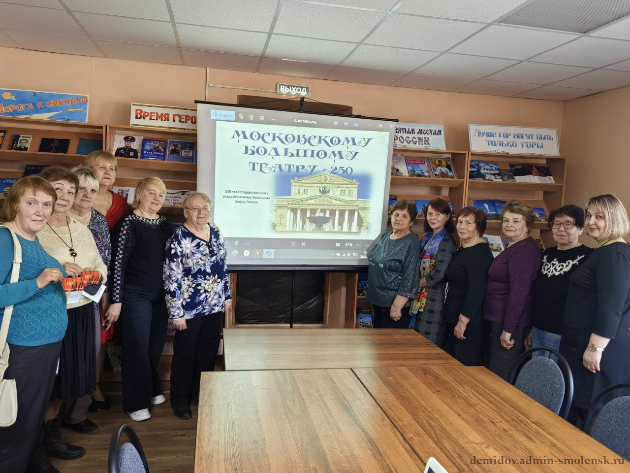 В рамках «Литературного четверга» и празднования 250-летия Государственного Академического Большого театра, 26 марта в Демидовской центральной библиотеке прошло виртуальное путешествие в прошлое и настоящее театра «Волшебный мир Большого театра». Присутствующие узнали об истории создания, творческом пути, знаменитых актерах, покоривших мировые сцены. Были показаны отрывки из спектаклей, поставленных на сцене театра.
