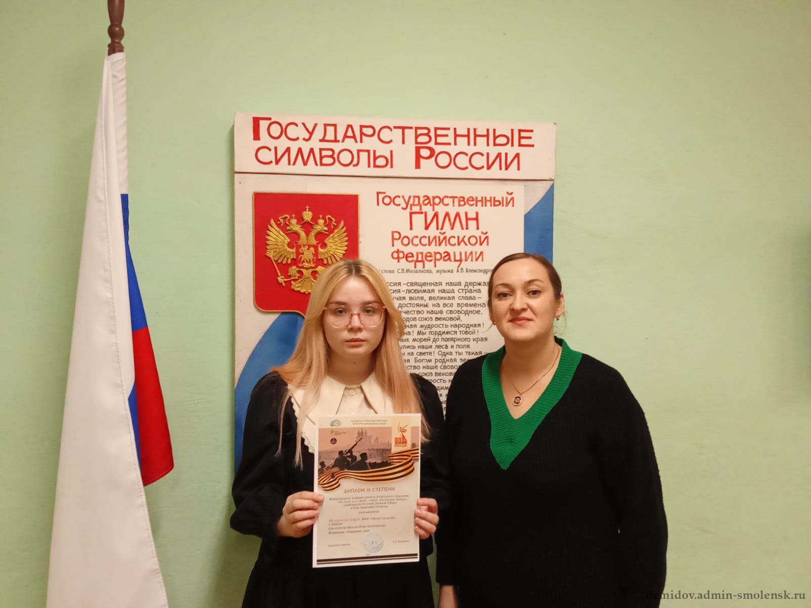 По итогам конкурса ученица МБОУ СШ N1 г. Демидова Мещерякова София заняла почётное 3-е место в номинации "Сочинение, эссе" (руководитель-Маслова Юлия Валентиновна) и стала лауреатом в номинации "Рисунок" (руководитель- Мещерякова Юлия Владимировна).