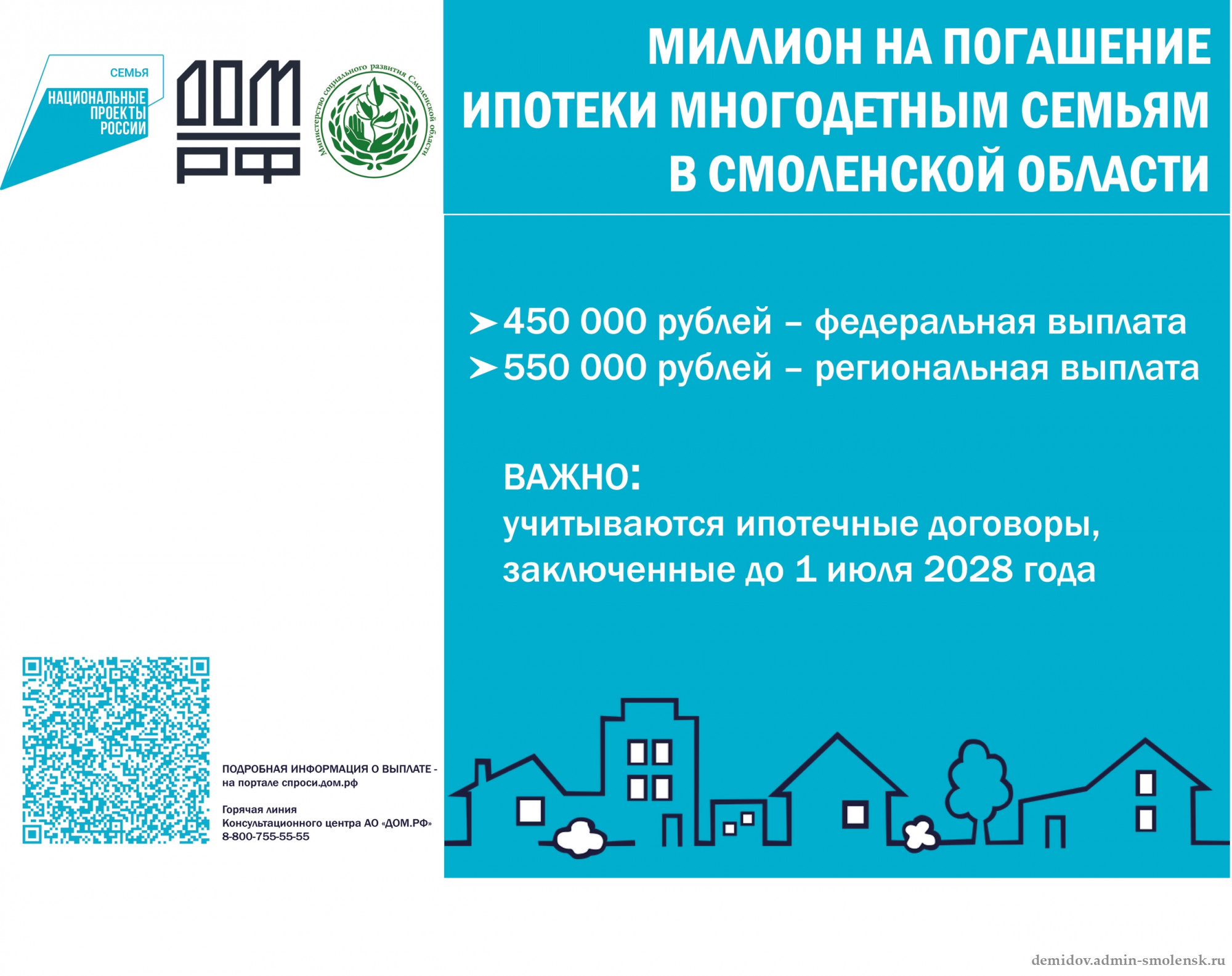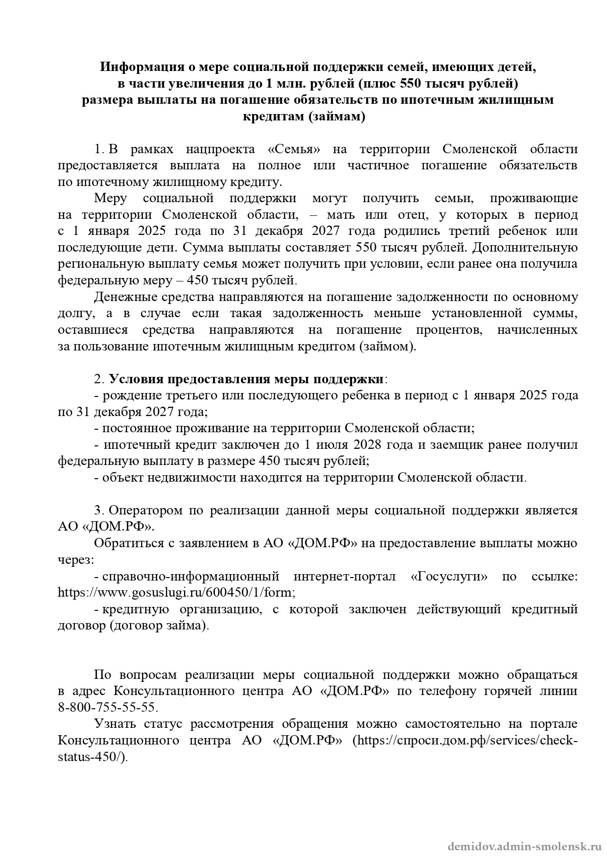 - социальная поддержка семей, имеющих детей, в части увеличения до 1 млн. рублей размера выплаты на погашение обязательств по ипотечным жилищным кредитам (займам),